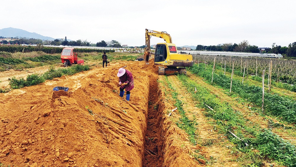 農田就是公園,公園就是農田。行走在淮山農業(yè)公園,一排排綠植爬滿了支架,綠植的根部就是新圩村特色農作物——淮山、粉葛。田地里,有村民坐在小板凳上開挖,有村民請來挖土機幫忙,一根根粗壯結實的淮山、粉葛從沙土中露出來,大家小心地將它們拔出來,整齊地排在田間,等待最后打包。