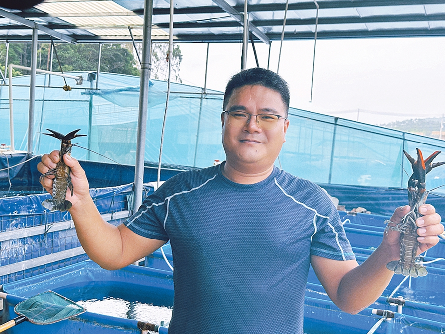 李志敏展示他養(yǎng)殖的藍(lán)龍蝦。