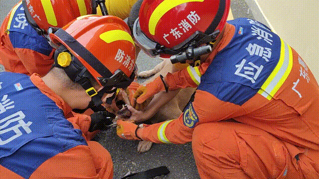 由于套住時間過長,“金毛”的牙齦已經(jīng)出血,稍微觸碰安全鉤都會給它帶來巨大的痛感而進行反抗。消防員建議這對夫妻先到附近寵物醫(yī)院給狗狗打麻醉后再實施救助。