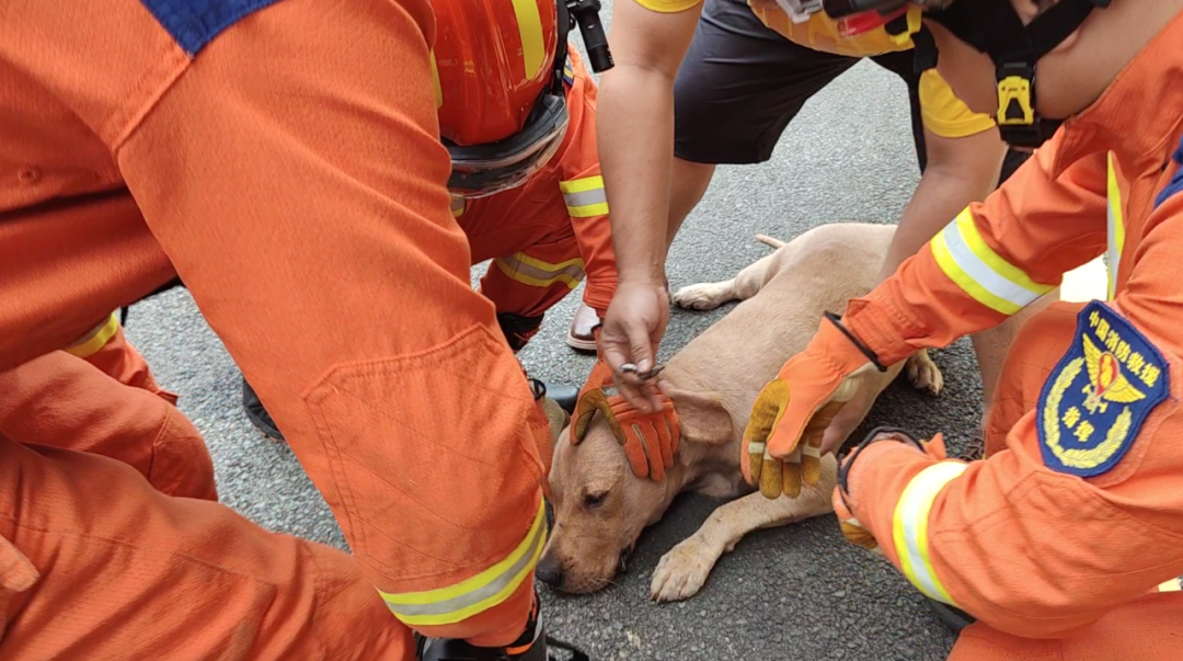 一段時間后,該夫妻再次帶著打完麻醉的“金毛”來到站里,這時狗狗明顯沒有過多的反抗。在狗狗的男主人與消防員的共同配合下,消防員使用鋼筋速斷器將安全鉤裸露的一側進行剪切,不到10秒的時間便將安全鉤成功取下,“金毛”也終于舒服地趴在地上。