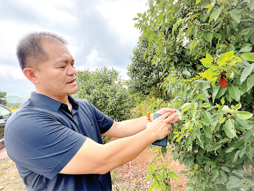 種植基地相關(guān)負(fù)責(zé)人介紹龍腦樟生長(zhǎng)情況。