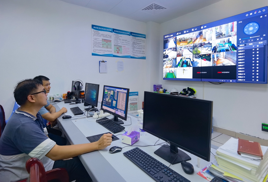 工作人員在橋南排澇站監(jiān)控室監(jiān)控排澇情況。 惠州日報記者湯渝杭 攝