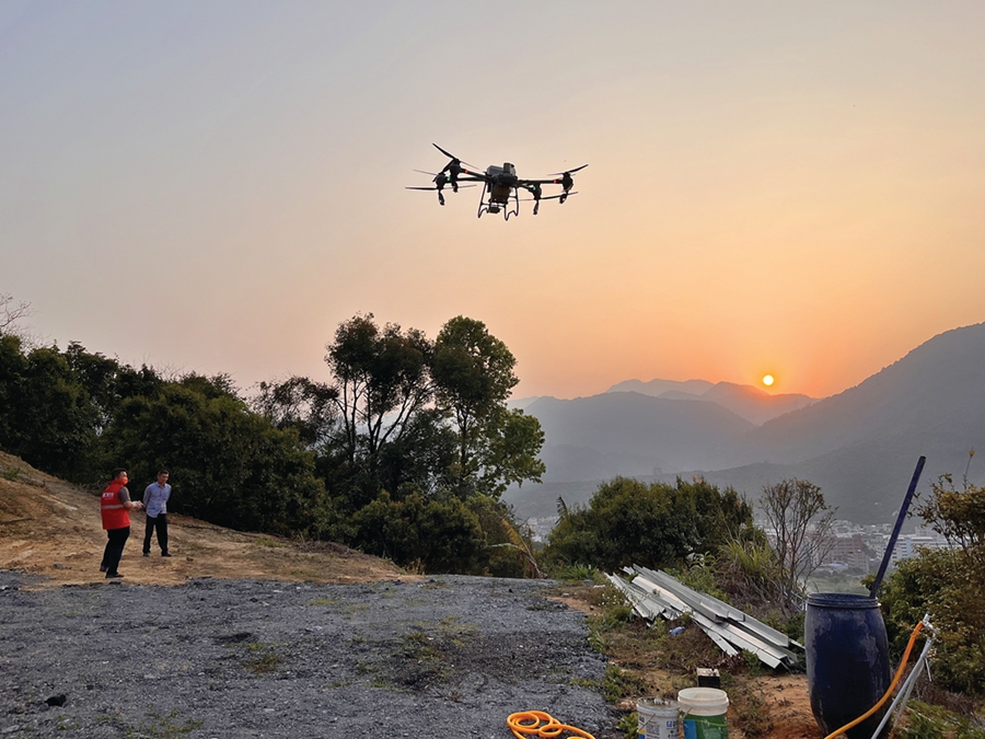 長龍村供銷社助農(nóng)服務(wù)中心飛防專業(yè)服務(wù)隊(duì)利用無人機(jī)提高作業(yè)效率。 惠州日?qǐng)?bào)記者李芳娟 通訊員張偉鋒 攝
