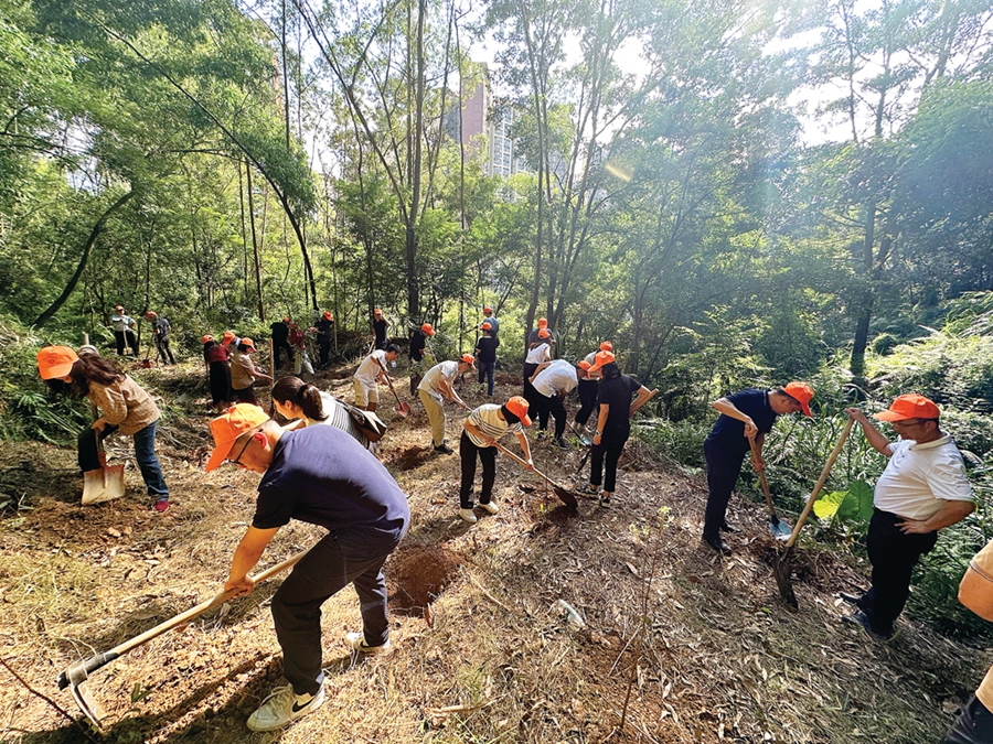 揭牌儀式后,參與人員帶著鐵鍬徒步登亞公頂,來到“人才林”區(qū)域開始義務(wù)植樹。扶正、培土、提苗、踩實、澆水……各個環(huán)節(jié)銜接有序、配合默契,不一會兒就將鳳凰木、宮粉紫荊、火焰木等樹苗種植在規(guī)劃區(qū)域內(nèi),為亞公頂森林公園增添了濃濃綠意。
