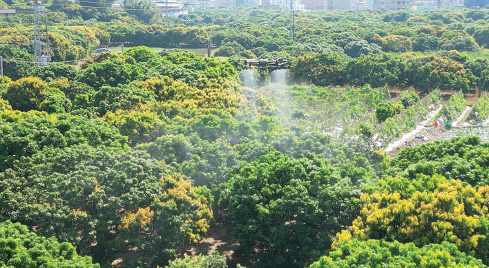 利用無人機(jī)給荔枝樹打藥省時省力。 惠州日報記者李芳娟 通訊員張偉鋒 攝