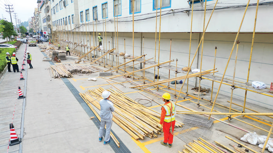 工人對(duì)房屋外立面進(jìn)行改造提升。 惠州日?qǐng)?bào)記者許文昌 通訊員張智軍 李福遇 攝