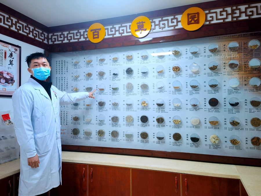 鎮(zhèn)隆鎮(zhèn)衛(wèi)生院中醫(yī)館內陳列著各種中藥材。