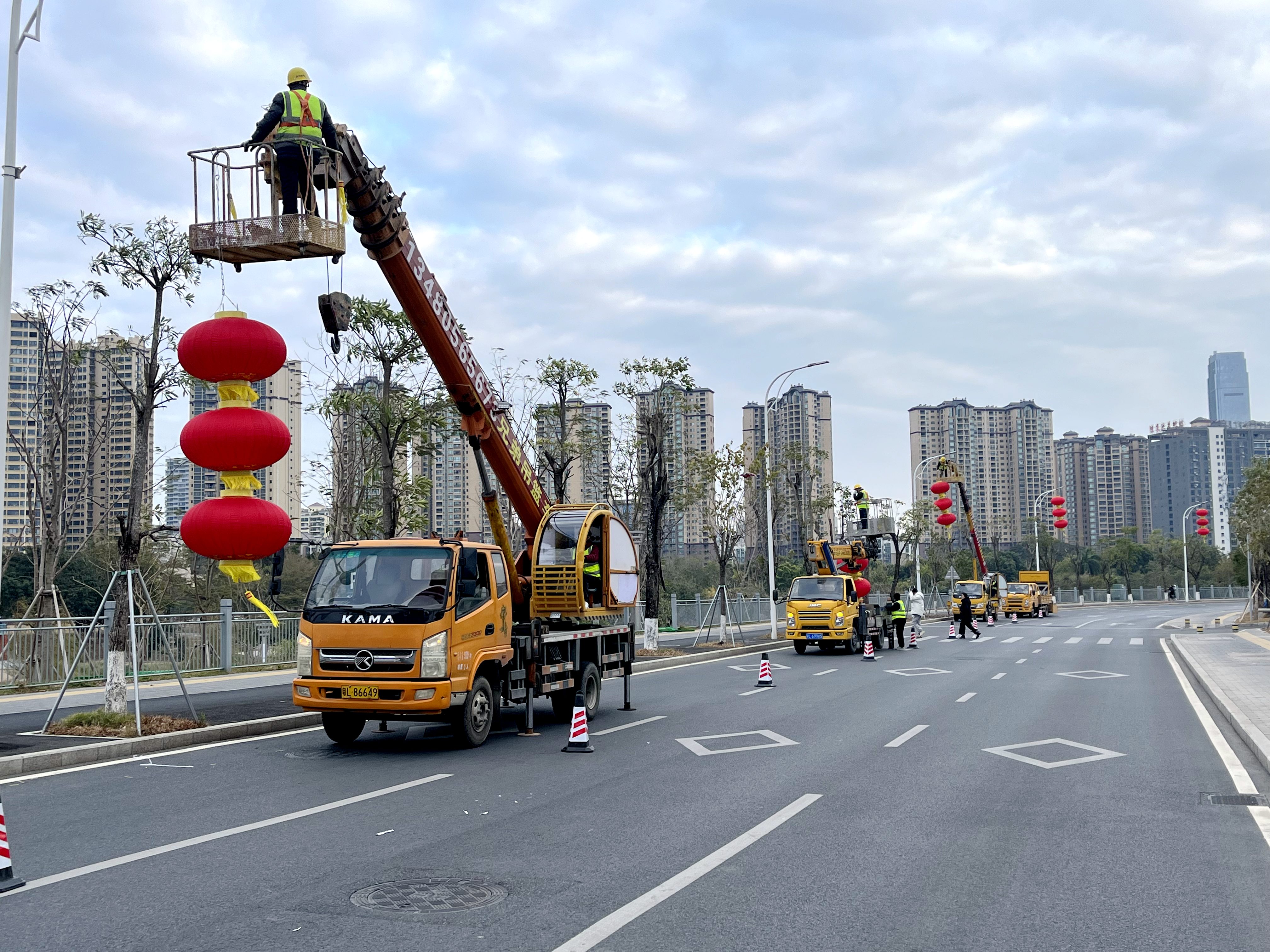 日前,記者在靠近惠陽濱水公園的半島路上看到,工人們在作業(yè)車上抓緊將紅燈籠掛上樹。微風(fēng)吹拂下,一串串鮮艷的紅燈籠隨風(fēng)搖擺,五顏六色的時花爭奇斗艷,喜氣洋洋,格外吸引眼球,引得不少路過的市民紛紛打卡拍照。“年味越來越濃了。”途經(jīng)的市民劉許玥望著紅燈籠說。