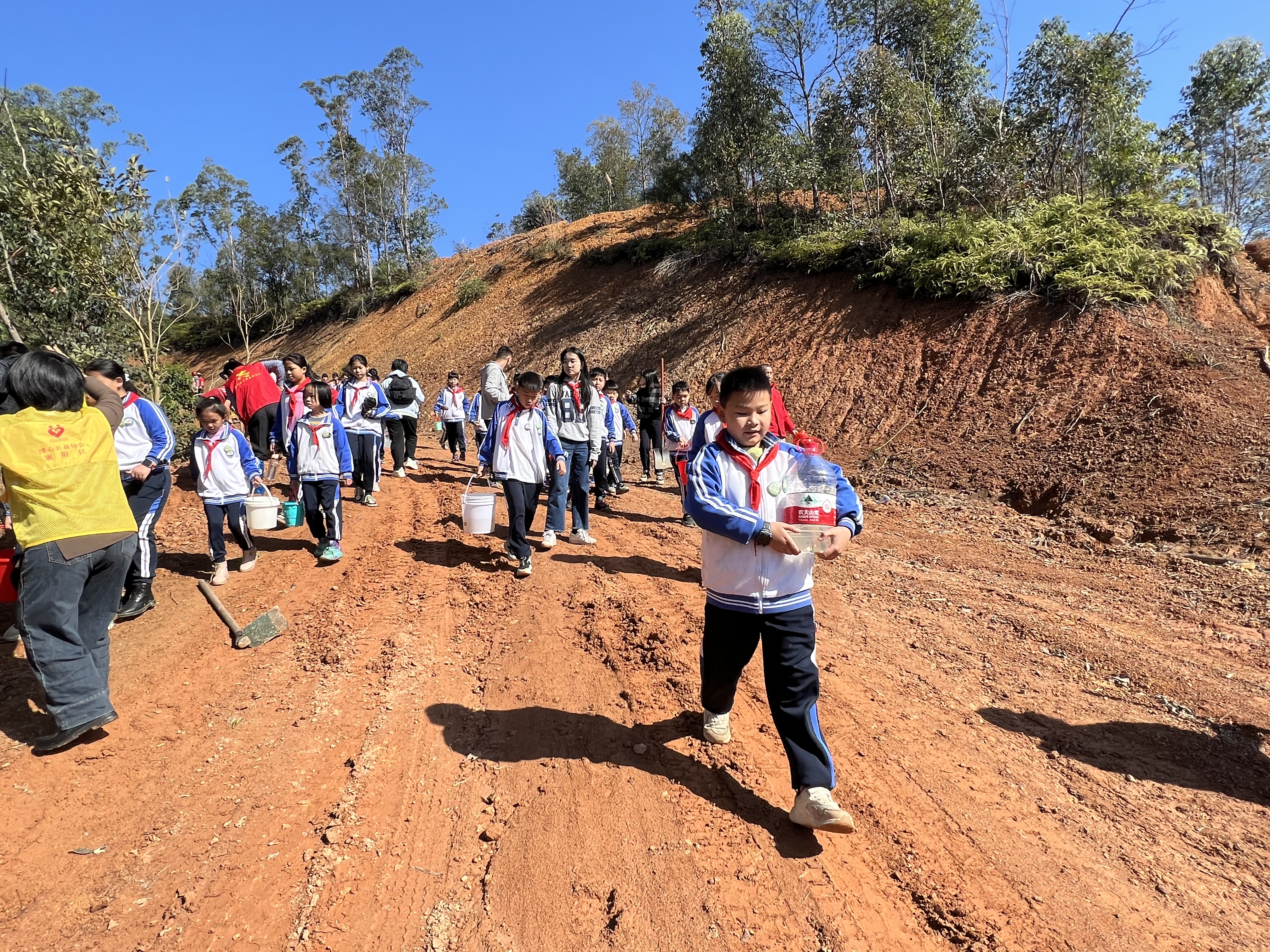 新圩小學(xué)生給新栽的樹苗澆水。