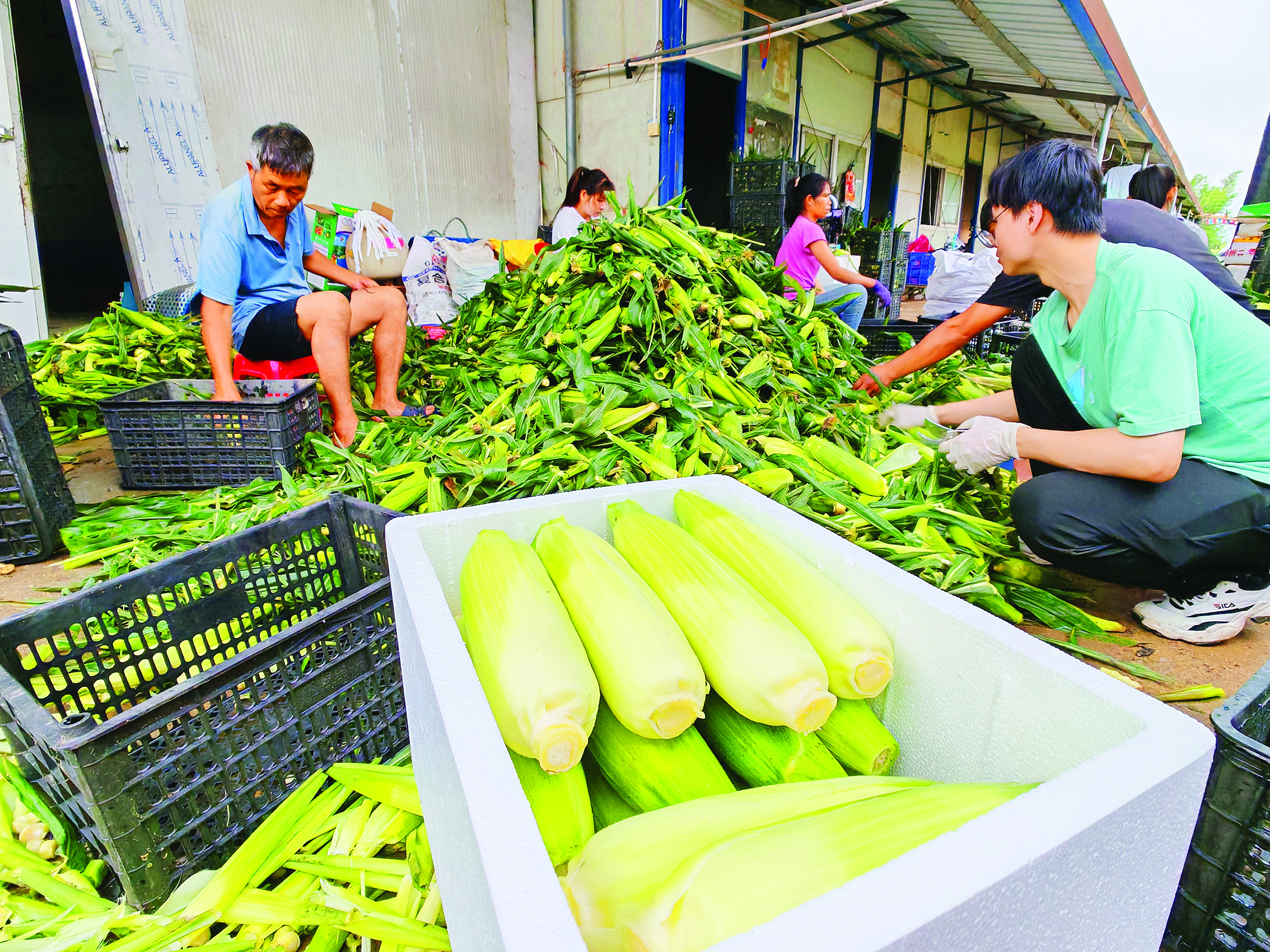 那頭的田間忙個不停,這邊的大棚下,工人們對玉米進行修剪、稱重、打包、發(fā)貨,有條不紊。