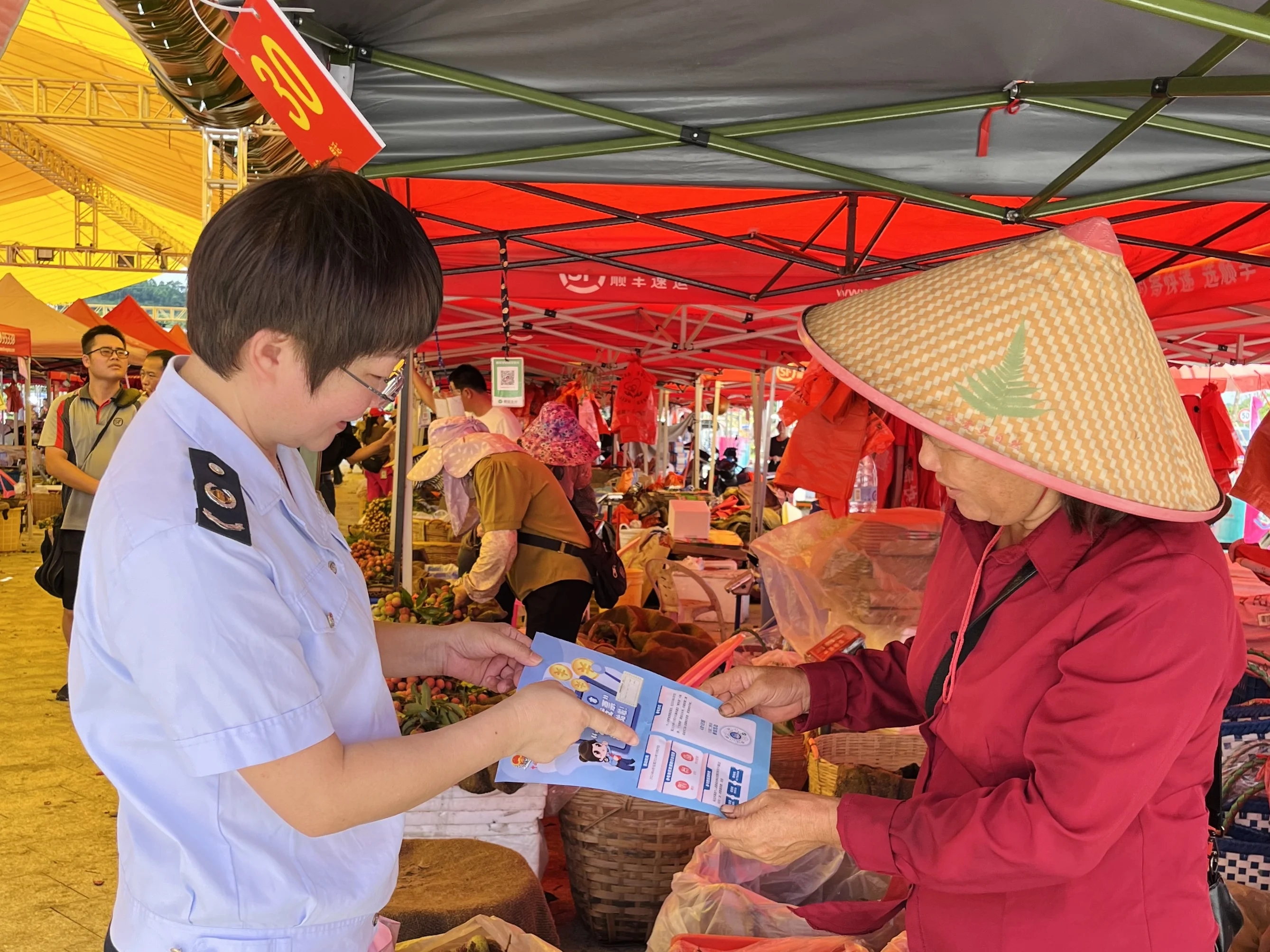 在鎮(zhèn)隆荔枝交易火爆之際,惠陽區(qū)稅務(wù)局走進(jìn)惠陽區(qū)RCEP廣東惠州(鎮(zhèn)隆)荔枝交易中心,現(xiàn)場(chǎng)宣傳農(nóng)產(chǎn)品增值稅稅收優(yōu)惠政策、詳細(xì)講解發(fā)票開具等熱點(diǎn)知識(shí),吸引大批果農(nóng)、采購商、消費(fèi)者紛紛駐足咨詢。