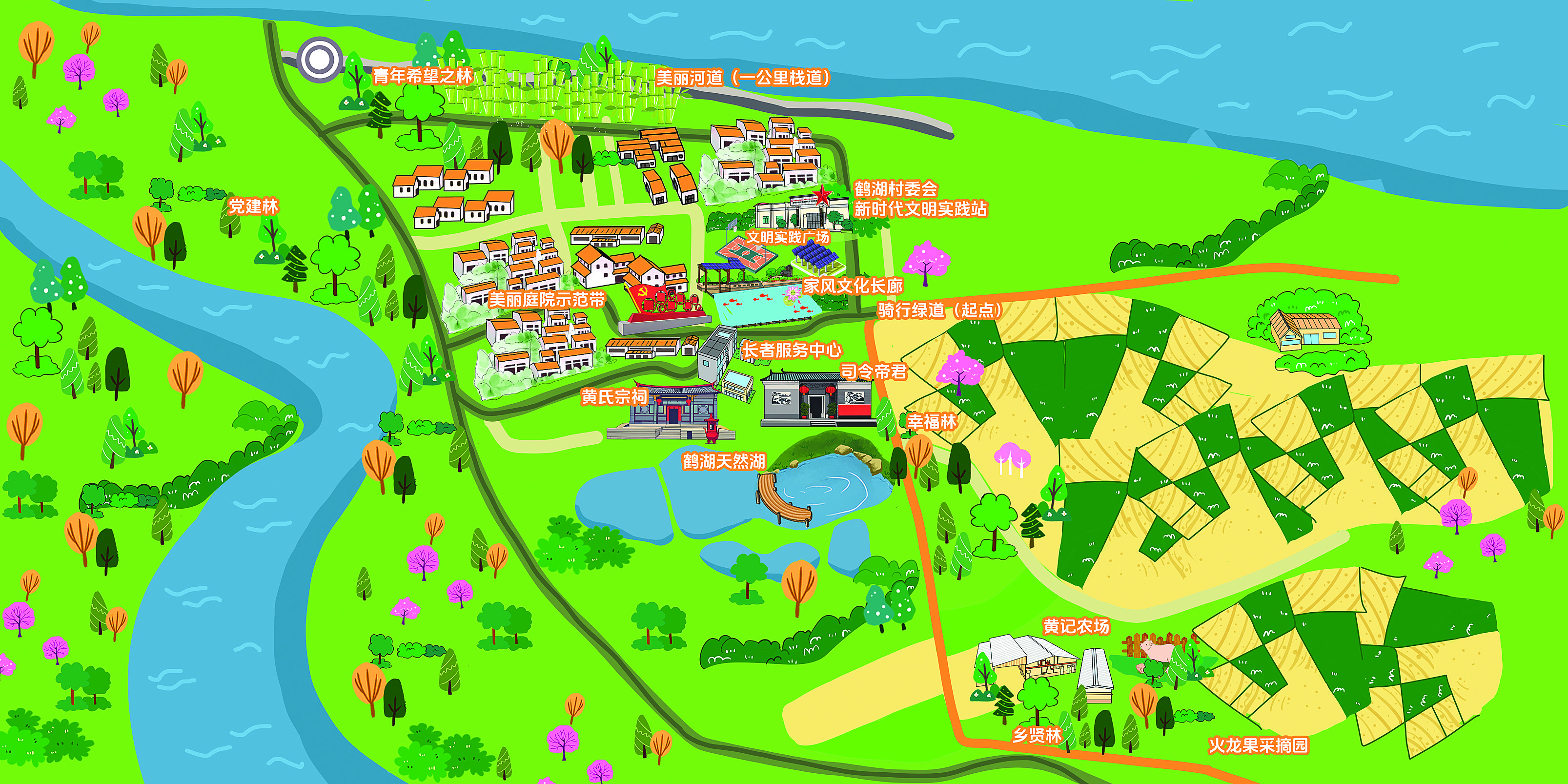 “通過打造,我們的村莊越來越美了。”鶴湖村黨總支書記徐冠嶺表示,村莊以“記得住鄉(xiāng)愁”為發(fā)展定位。日前,該村發(fā)布首張農(nóng)文旅路線圖,上面詳細(xì)標(biāo)注青年希望之林、美麗庭院示范帶、家風(fēng)文化長廊、文明廣場、騎行道、鶴湖天然湖、黃氏宗祠、賢林、采摘園等地方,為游客勾勒出一幅“按圖索驥”的鄉(xiāng)村游玩指南。這也標(biāo)志著鶴湖村農(nóng)文旅融合邁入新階段。