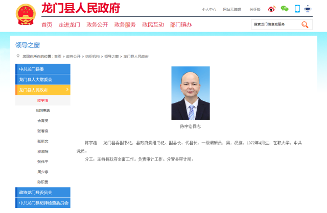 1月4日,龍門縣人民政府官方網(wǎng)站“領(lǐng)導(dǎo)之窗”欄目顯示,陳宇浩任龍門縣委副書記,縣政府黨組書記、副縣長、代縣長,主持縣政府全面工作,負(fù)責(zé)審計工作,分管縣審計局。