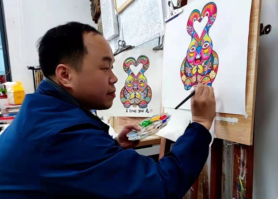 “目前,共創(chuàng)作了五個(gè)款式,近十個(gè)版本。”鐘永廉表示,他用龍門農(nóng)民畫的表現(xiàn)形式,融入美好寓意,畫了新穎的作品,如《I love you 兔》,一只呆萌的兔子耳朵合成“愛心”圖案,雙前腿做“比心”動作,是針對年輕人比較喜歡的、造型可愛的方面去考慮創(chuàng)作的,也迎合了市場審美需求。