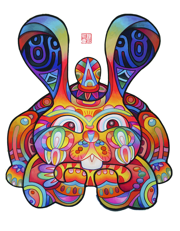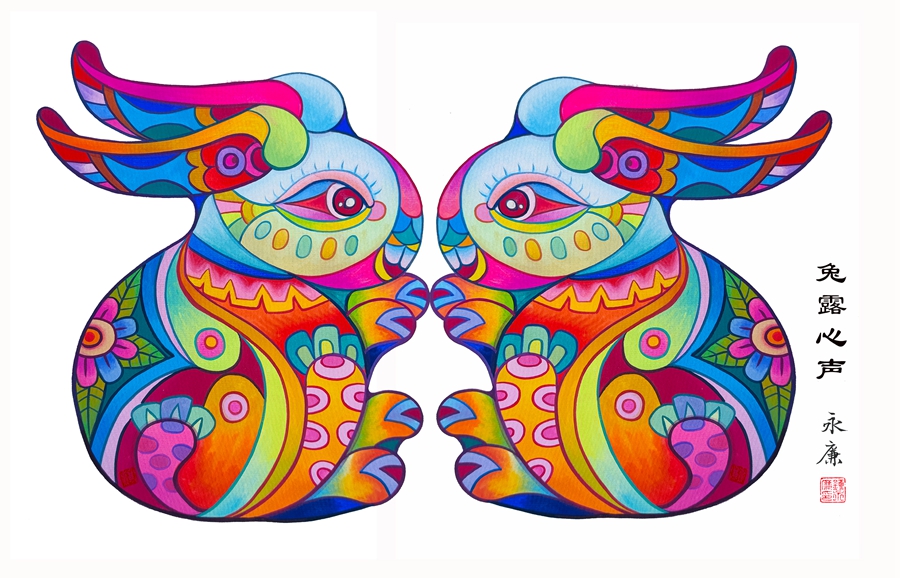 卯兔位列十二生肖之四,“卯”代表春意,代表黎明,充滿無限生機(jī),“兔”的諧音則有揚(yáng)眉吐(兔)氣、前途(兔)似錦、大展宏圖(兔)等,蘊(yùn)含美好寓意。85后畫家鐘永廉創(chuàng)作的《瑞兔呈祥賀新年》系列作品,包括《兔氣揚(yáng)眉》《兔年有余》《兔露心聲》《瑤兔獻(xiàn)瑞》《I love you 兔》等,傳統(tǒng)與現(xiàn)代結(jié)合,色彩鮮艷,造型生動,展現(xiàn)對生活美好的祝愿。