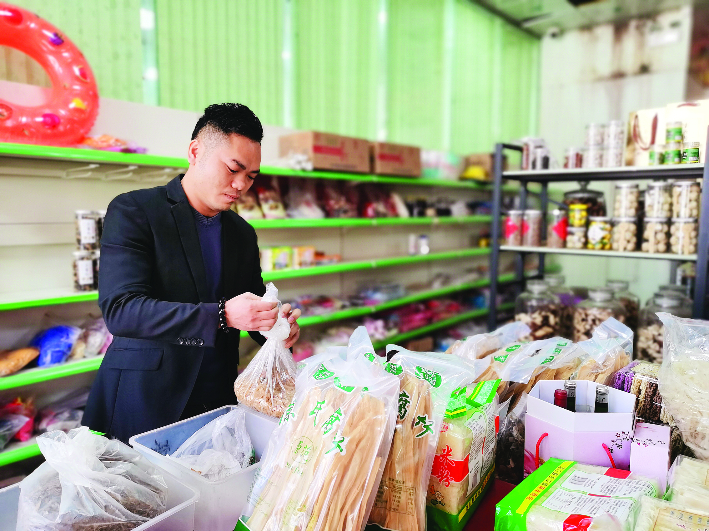 走進(jìn)店里,只見前來用餐的客人絡(luò)繹不絕。一旁的特產(chǎn)店里,腐竹、米絲等龍門本地特產(chǎn)應(yīng)有盡有。通過打造“餐飲-住宿-農(nóng)特產(chǎn)”一條龍經(jīng)營模式,姚文超帶動(dòng)30名本地村民就業(yè),其中有兩名是退役軍人。同時(shí),他還跟10戶農(nóng)戶簽訂固定供貨協(xié)議,幫助農(nóng)戶銷售蔬菜、家禽、魚類等食材,帶動(dòng)戶均增收5萬元。