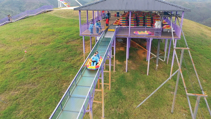 游人在龍門 鹿鷹科普生態(tài)園體驗玻璃水滑道項目。 惠州日報記者湯渝杭 攝