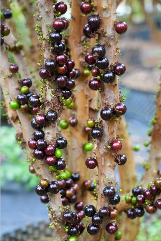 樹干上密密麻麻長滿黝黑發(fā)紫的果子,外形像極了黑葡萄,這是有著“樹葡萄”之稱的嘉寶果。