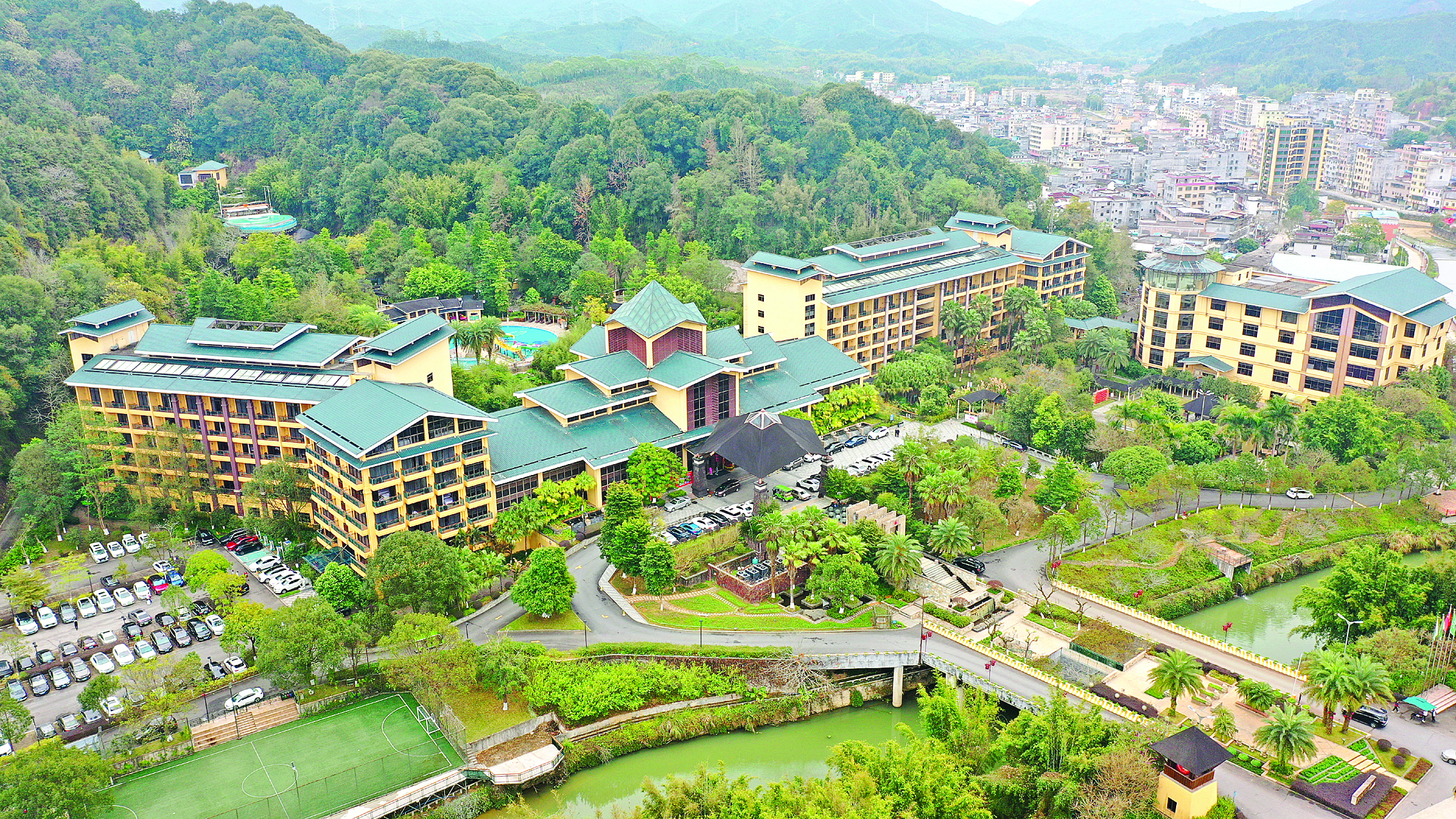 桂峰山下,是常年流淌的溫泉水。1960年,廣東省醫(yī)學科學院礦泉研究室專家曾到地派勘測,認為地派溫泉水質好,又離圩鎮(zhèn)近,若通過鉆探提高水溫和流量,很有經(jīng)濟價值。2010年,地派鎮(zhèn)的首張旅游王牌——地派溫泉森林度假區(qū)(以下簡稱“地派溫泉”)建成營業(yè),至今,仍是龍門最受游客歡迎的溫泉度假區(qū)之一。