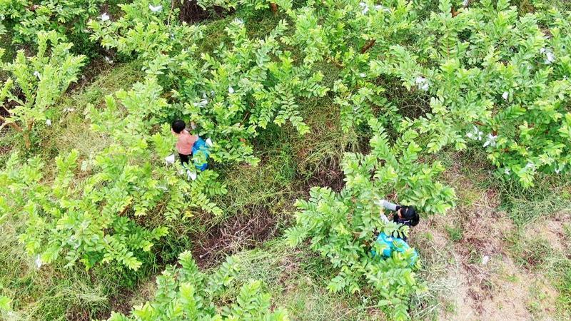 走進(jìn)種植基地,只見番石榴樹茂密成蔭,寬大的樹葉間掛滿了穿著白色“外套”的果實(shí)。下龍村村民陸醒明是該基地的負(fù)責(zé)人,種植番石榴已經(jīng)有4年。2020年,他通過承包村里的閑置撂荒地,整理出了這片適宜番石榴生長的地塊,開始了番石榴的種植之路。
