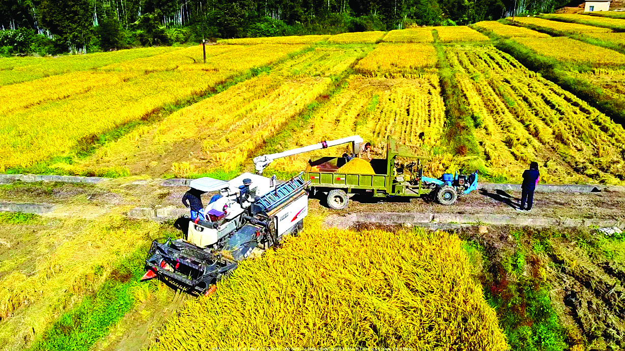 藍田瑤族鄉(xiāng)小洞村富硒稻種植基地上,收割機緊張作業(yè)。 惠州日報記者黃宇翔 通訊員龍融心 攝