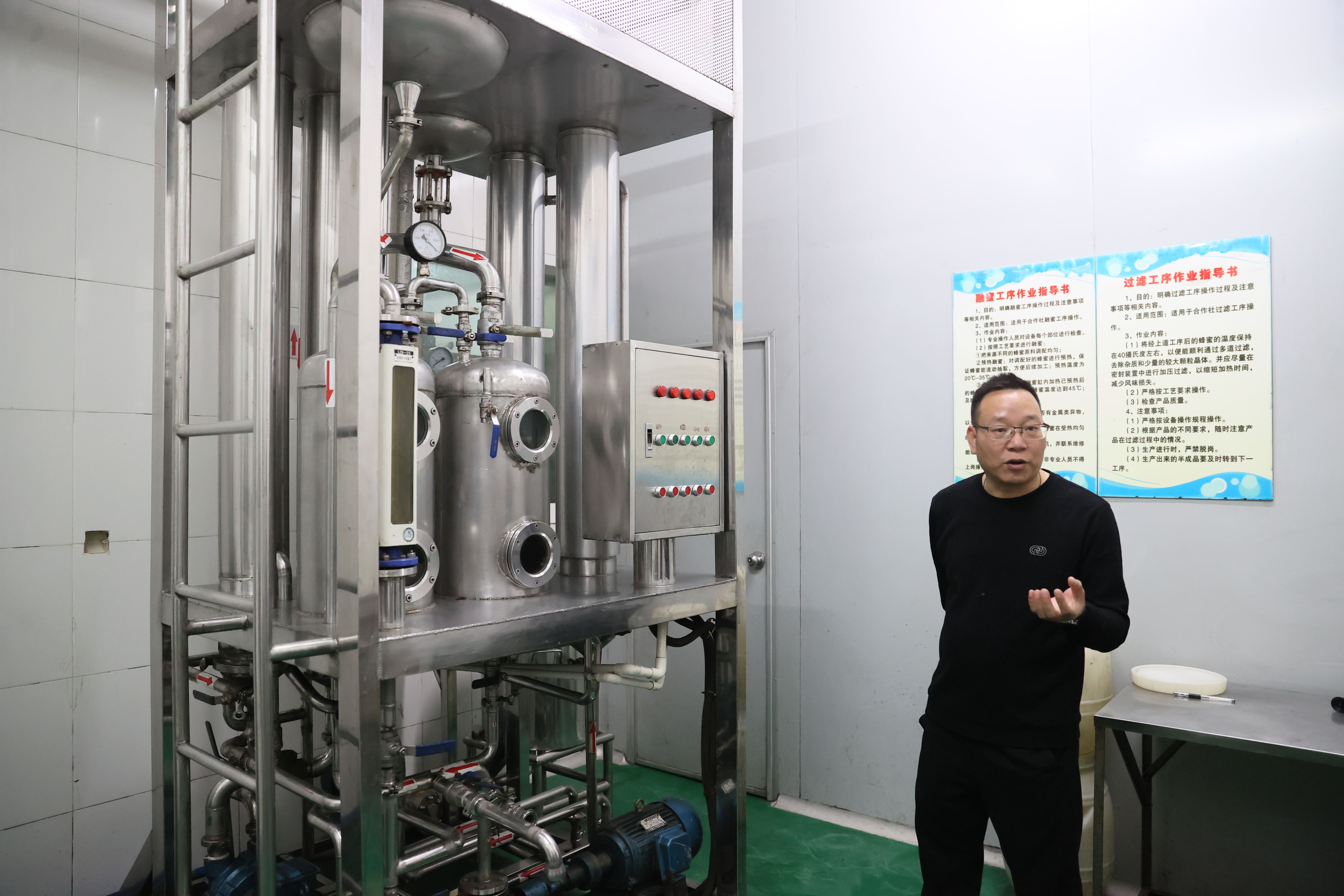 鐘國平在介紹蜂蜜初加工過程。