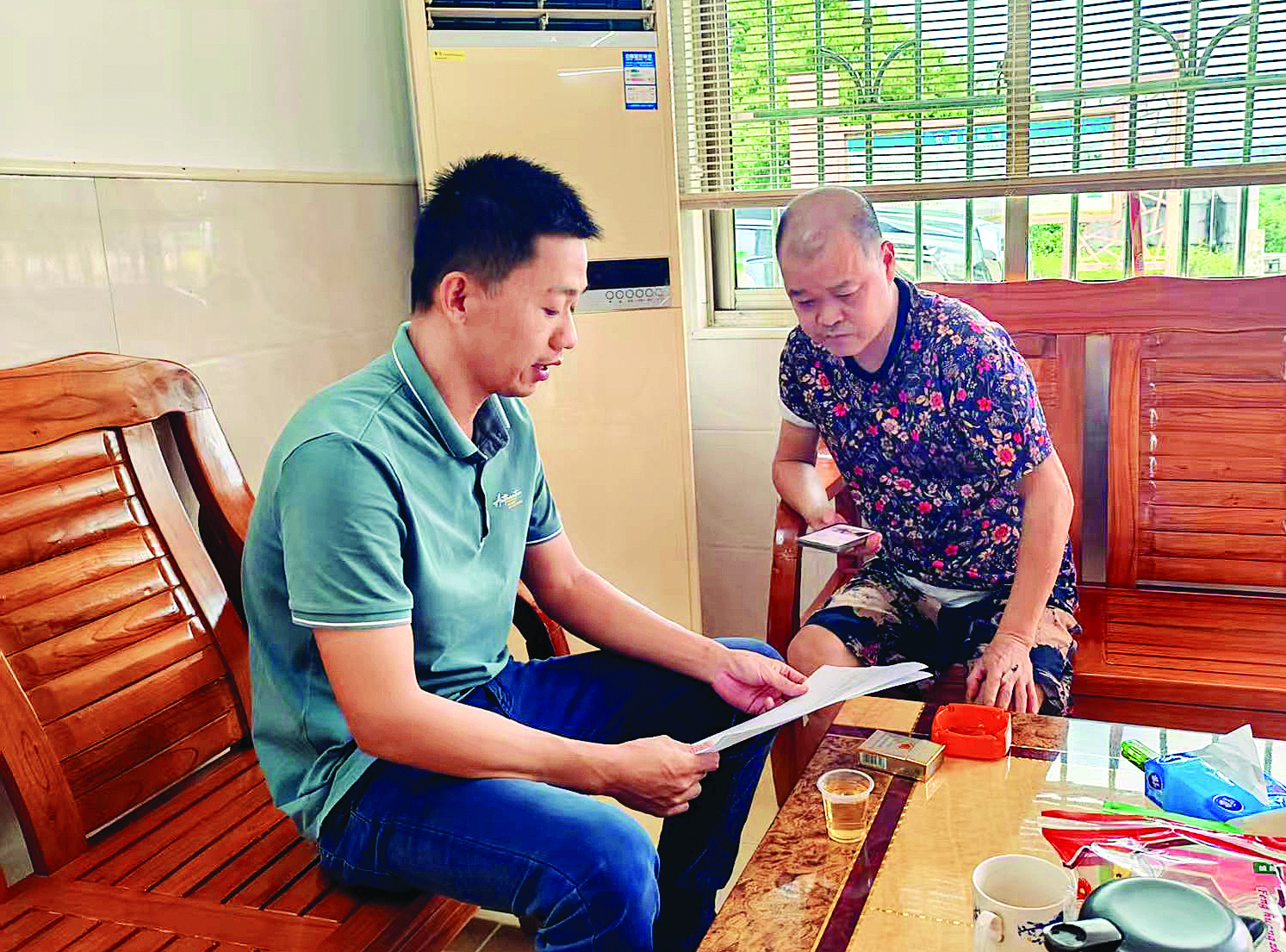 萬建康(左)向村民解讀惠民政策。