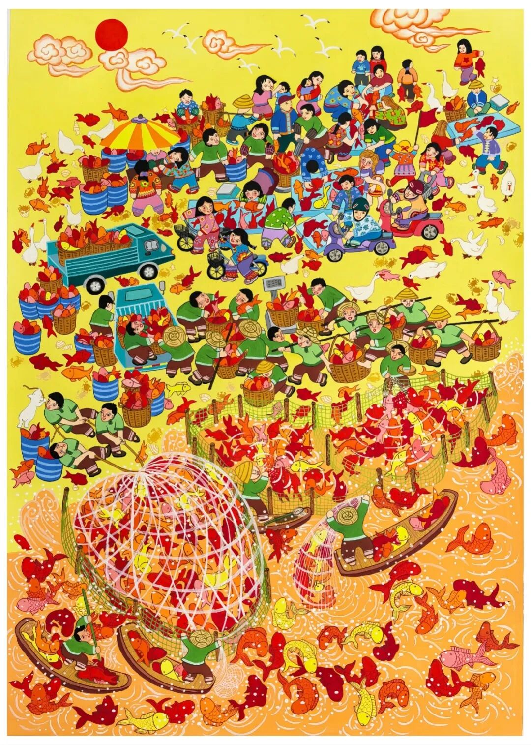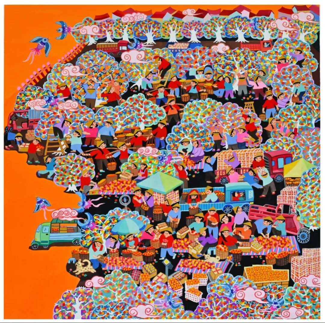 作為“中國(guó)現(xiàn)代民間繪畫畫鄉(xiāng)”“中國(guó)民間文化藝術(shù)之鄉(xiāng)”,龍門農(nóng)民畫多年來堅(jiān)持以濃墨重彩記錄生活本真,用質(zhì)樸筆觸傳遞鄉(xiāng)土情懷。此次入選的4幅作品,延續(xù)了當(dāng)?shù)剞r(nóng)民畫色彩明艷、構(gòu)圖飽滿的藝術(shù)特色,既聚焦嶺南農(nóng)事節(jié)慶、漁鄉(xiāng)市集等傳統(tǒng)題材,又融入新時(shí)代鄉(xiāng)村振興的鮮活氣息,把勞動(dòng)的喜悅、豐收的盛景和群眾對(duì)美好生活的向往,實(shí)實(shí)在在地畫在了紙上,成為嶺南民俗文化的生動(dòng)寫照。