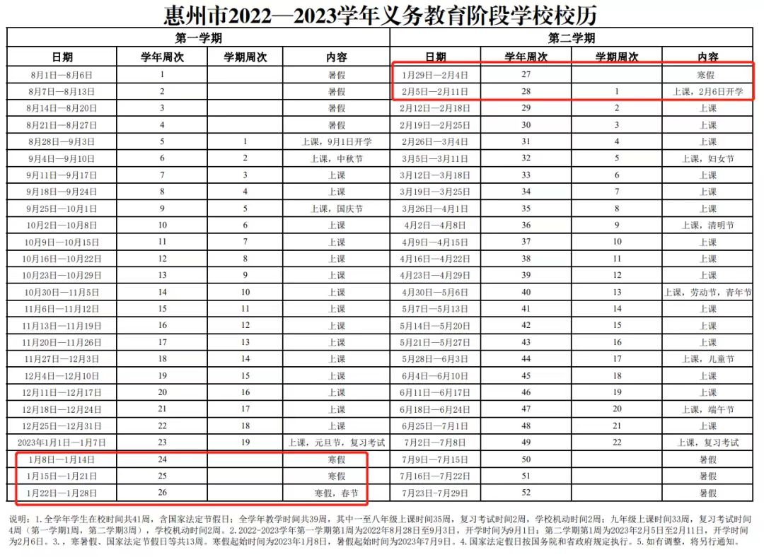惠州市義務(wù)教育階段寒假起始時(shí)間為2023年1月8日開始;開學(xué)時(shí)間為2月6日。