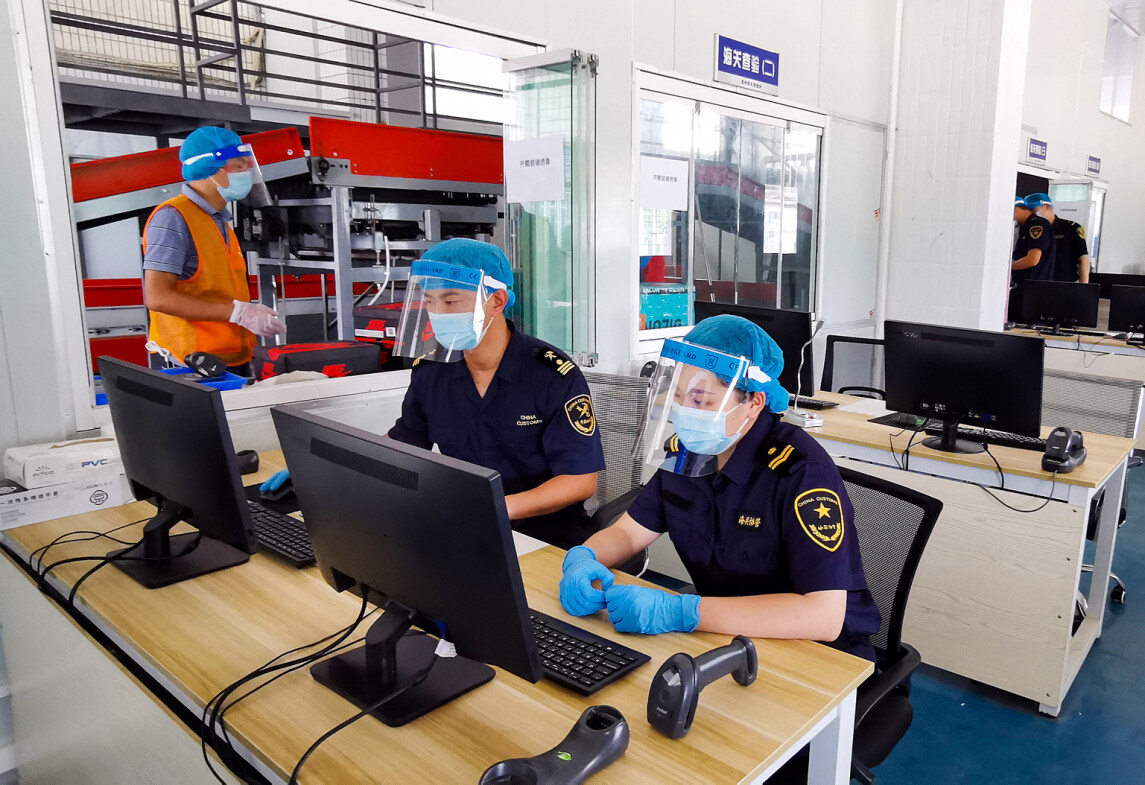 惠州海關(guān)關(guān)員對(duì)出口跨境電商貨物過機(jī)檢驗(yàn)。