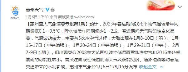 惠州日報(bào)訊 (記者劉建威)據(jù)惠州市氣象臺(tái)1月6日下午發(fā)布,預(yù)計(jì)2023年春運(yùn)期間我市平均氣溫較常年同期偏低0.1~0.5℃,降水較常年同期偏少一至兩成。