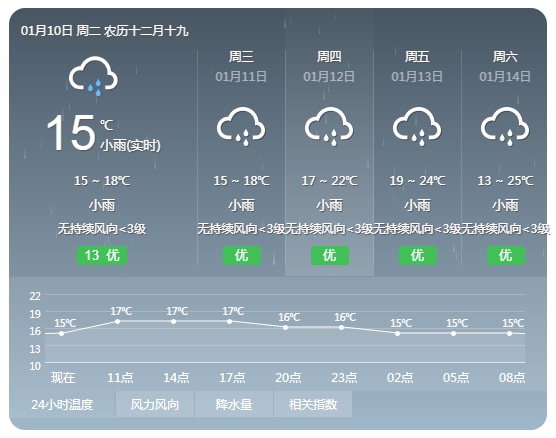 惠州一周天氣預(yù)報預(yù)計(jì),10日,小雨轉(zhuǎn)陰天,氣溫15~18℃;11日,陰天,有小到中雨,氣溫15~18℃;12日,小到中雨局部大雨,氣溫15~20℃;13日到14日,小到中雨轉(zhuǎn)陰天,氣溫回升;15日起,受冷空氣影響,各地云量逐漸減少,北風(fēng)加大,氣溫明顯下降。