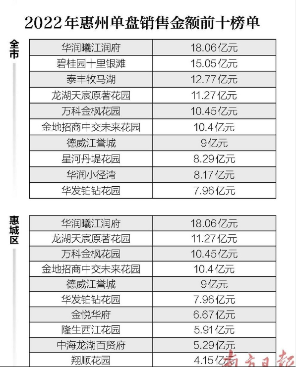 聚焦單盤銷售表現(xiàn),2022年惠州樓市在區(qū)域板塊上呈現(xiàn)集聚行情。相比以往惠陽、大亞灣地區(qū)樓盤的突出表現(xiàn),去年市場主城區(qū)惠城區(qū)項(xiàng)目集中發(fā)力,契合了剛需自住需求撐市的基本面。