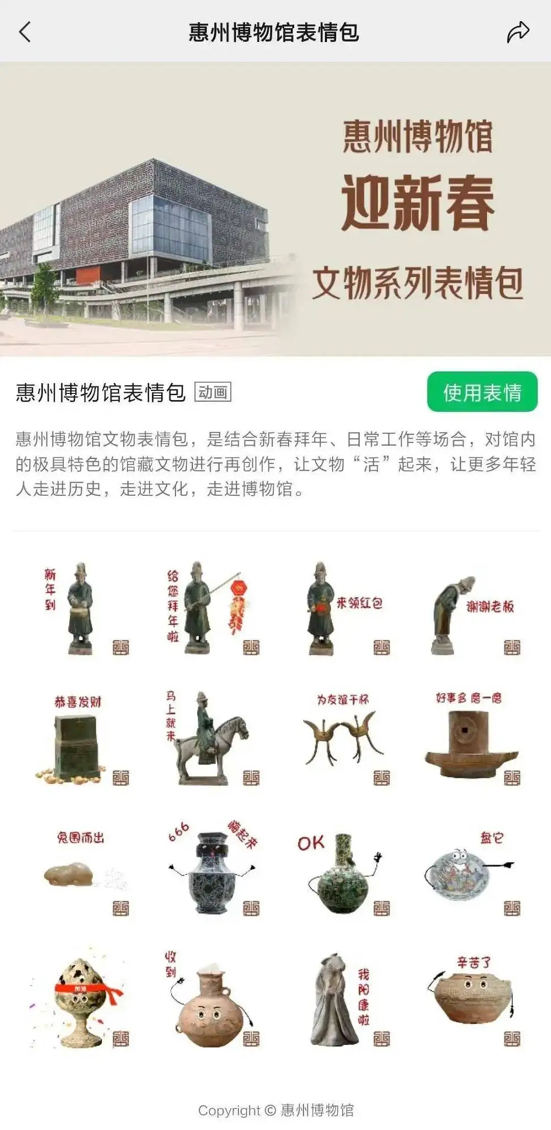 近日,惠州市博物館制作發(fā)布了首套“迎新春”文物表情包。在館藏文物精品的基礎(chǔ)上,融入現(xiàn)代大眾的生活元素,這一系列表情包可以讓年輕朋友走近市博物館,走進(jìn)惠州的歷史文化。通過微信表情商店搜索“惠州博物館”,或掃描二維碼就可以免費(fèi)下載。