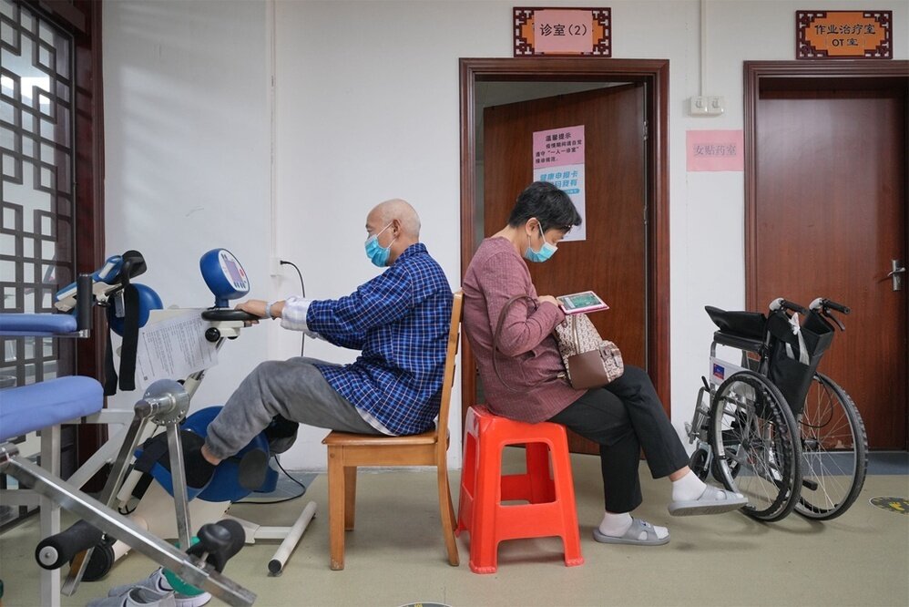 2022年1月14日,惠東縣中醫(yī)醫(yī)院一處康復設(shè)備前,兩位老人相互陪伴。