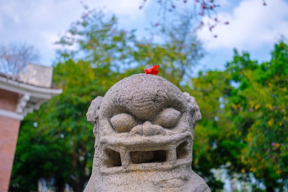 2022年3月17日,惠州市惠城區(qū)中山公園,綠樹叢中,一朵木棉花落在石獅頭上,春意滿滿。