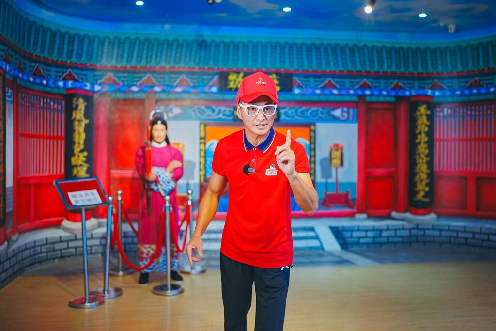 2022年8月9日,惠州水口勁家莊廠區(qū),港星何家勁在展昭蠟像前介紹自家保健食品。