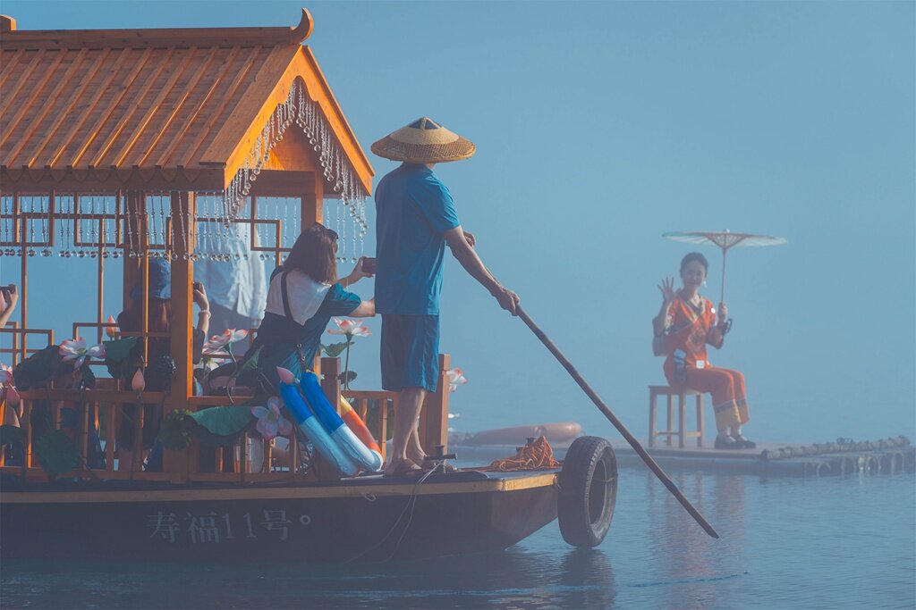 2022年7月28日,湖南省郴州市小東江上,惠州游客與竹排女互動。