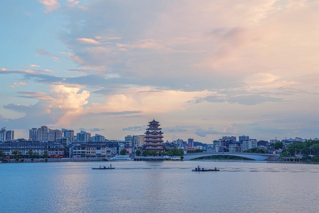 2022年7月16日,一位滑板運動員從惠州合江樓下飛躍而過。