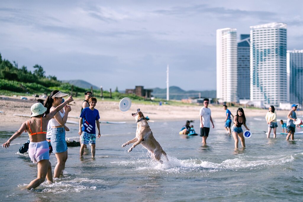 2022年8月20日,游客在雙月灣的海濱,來了一場水上飛盤游戲。