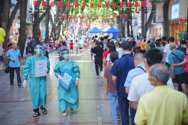 2022年10月4日,市民在惠州步行街街頭等待核酸檢測。