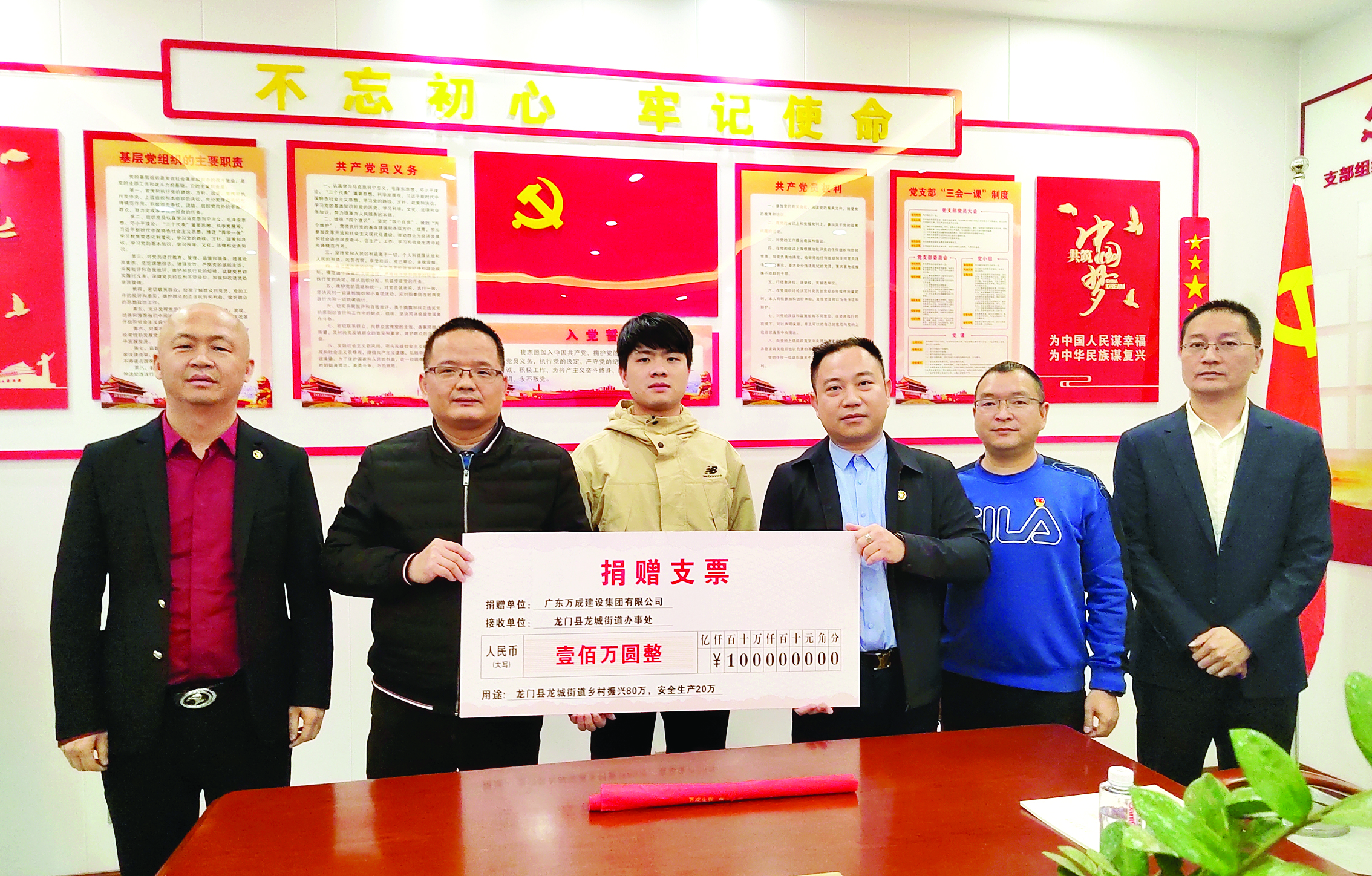 廣東萬成建設(shè)集團(tuán)有限公司法人代表潘曉志、廣東萬成建設(shè)集團(tuán)有限公司常務(wù)副總經(jīng)理林耿薪、浙江鯤鵬建設(shè)集團(tuán)總經(jīng)理趙金龍、中灣工程設(shè)計(jì)有限公司總經(jīng)理葉春蔚以及龍門縣龍城街道辦事處相關(guān)負(fù)責(zé)人等一行10余人參加捐贈(zèng)儀式。