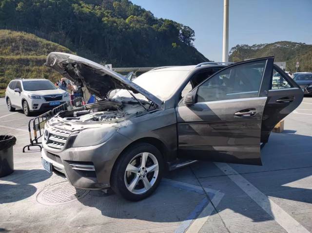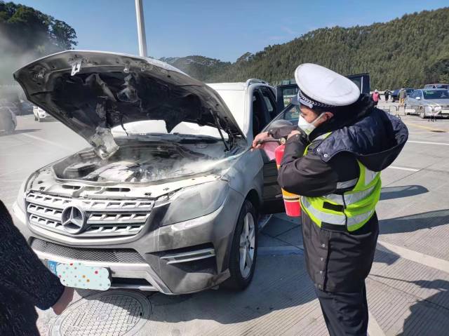 1月18日,在通驛粵東分公司所轄紫惠高速橫瀝停車區(qū)(往揭陽方向),一輛停放的奔馳車車頭突然著火。緊急關(guān)頭,交通協(xié)管隊(duì)員化身消防員,3分鐘就把火撲滅了。