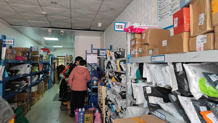 水北新村菜鳥驛站的貨架上擺滿了快遞包裹。