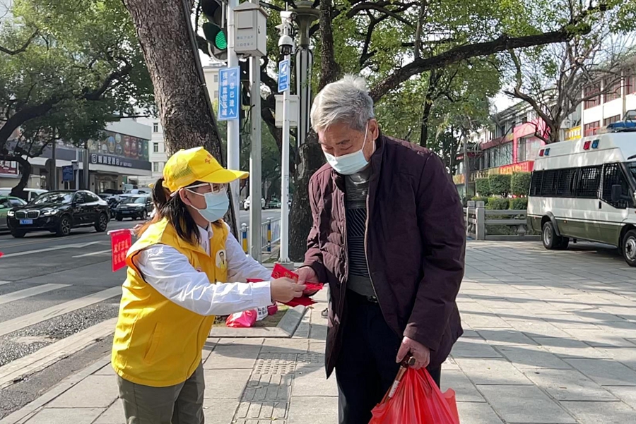 昨日,志愿者們以發(fā)“紅包”的創(chuàng)新方式倡導(dǎo)市民、游客文明出行。 惠州日?qǐng)?bào)記者張藝明 攝