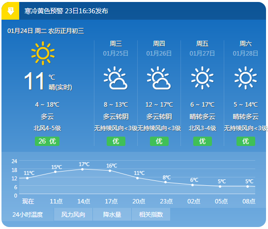 據市氣象臺預計,24~25日(初三至初四)受中等冷空氣影響,陰天到多云,氣溫下降6~8℃,初四早晨將出現本次過程最低氣溫2~4℃;26日(初五)多云到陰天,氣溫10~14℃;27日(初六)陰天到多云,有分散小雨;28~30日(初七至初九)多云到晴天,早晚寒冷。市氣象臺提醒,春節(jié)假期前期能見度較低,需注意交通安全;冷空氣影響期間海面風力較大,海島海岸旅游、過往船只需確保安全。