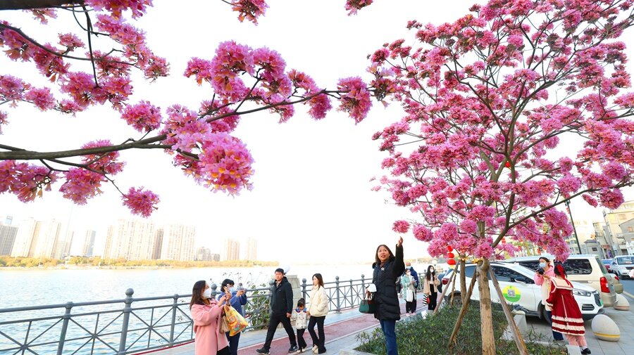 1月31日,在冬日暖陽(yáng)下,陸陸續(xù)續(xù)有市民來(lái)打卡,邂逅浪漫的紫花風(fēng)鈴。走近紫花風(fēng)鈴木,只見滿樹枝頭都是一簇簇紫紅色的花朵,整株樹幾乎沒有葉片,猶如編織了一個(gè)紫色的風(fēng)鈴。漫步其中,讓人在冬天里享受春天的感覺。
