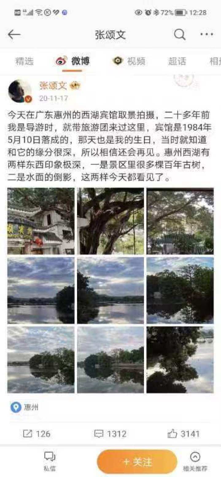 “今天在廣東惠州的西湖賓館取景拍攝,二十多年前我是導(dǎo)游時(shí),就帶旅游團(tuán)來過這里,賓館是1984年5月10日落成的,那天也是我的生日,當(dāng)時(shí)就知道和它的緣分很深,所以相信還會(huì)再見。惠州西湖有兩樣?xùn)|西印象極深,一是景區(qū)里很多棵百年古樹,二是水面的倒影,這兩樣今天都看見了。”2020年11月17日,張頌文在《掃黑決戰(zhàn)》拍攝期間,發(fā)微博表達(dá)了自己的感慨,字里行間,也對(duì)惠州的秀美景色諸多贊賞。