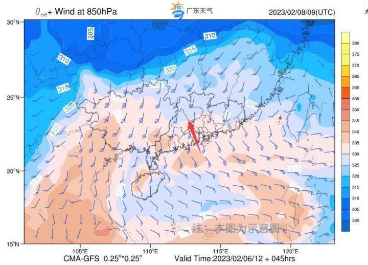 2月9日,廣東500百帕繼續(xù)受南支槽前西南氣流影響,850百帕7日夜間起至9日南風(fēng)明顯加大,925百帕有弱切變影響粵北,地面有弱冷空氣影響。