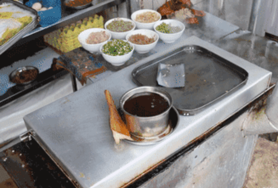 通過“雜技”般的技術(shù)動作,讓米漿均勻的分布在簸箕面上,再加入油條、雞蛋等喜歡的配料。